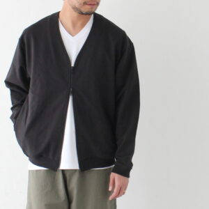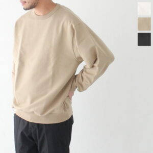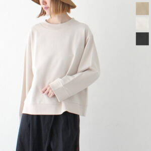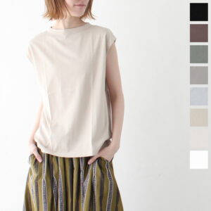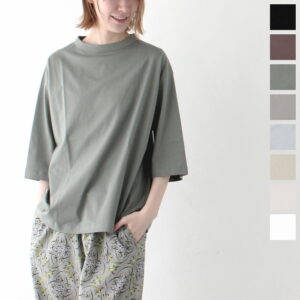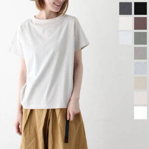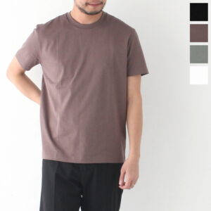 インナーのカットソーは脇にハギのない丸胴。特筆すべきはエリまわりで、布帛のパーツを充ててパイピング縫製処理。Tシャツ1枚で着ただけでもさまになります。