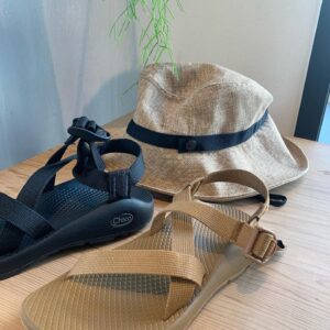 足元のchacoのサンダルは川にもザブザブ入れます。調節可能でどなたの足にもフィットする履き心地抜群のサンダルです。