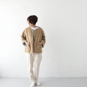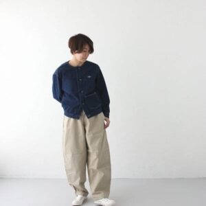 メンズのアイテムは袖口と裾にリブを配したスウェットのようなデザイン。素材は、太番手のコットンを度詰めに編んだヘビーウェイトジャージーを使用しています。スウェットよりも薄手でありながらロンTよりはしっかりと厚みのある生地感で今からの時期にとても活躍できます。
