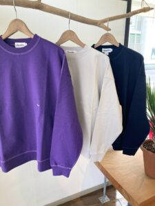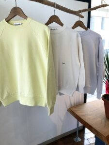 レディースはスタンダードなスウェットプルオーバーになります。身幅や袖にボリュームを持たせたゆとりのあるシルエットが特徴です。メンズのヘビーウェイトジャージーのガシっとした生地とは違い、オーガニックコットンを使用した柔らかく膨らみのある風合いに仕上げられています。