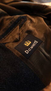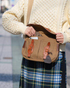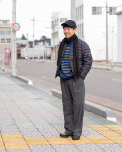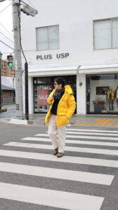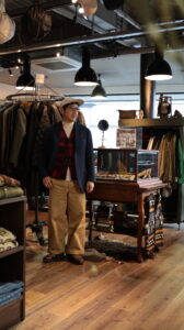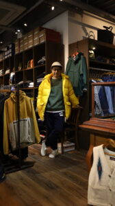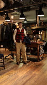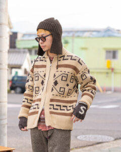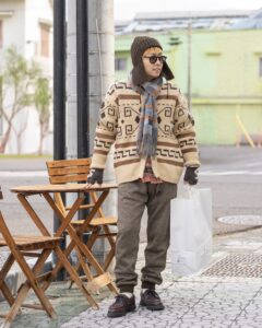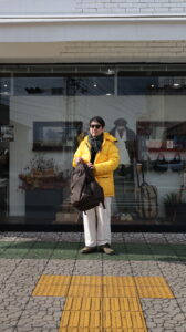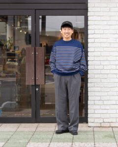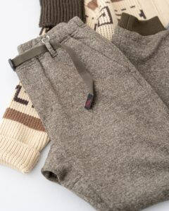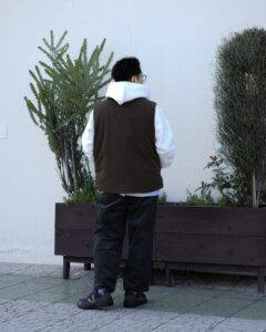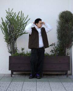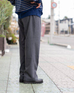 トップスはORCIVALのニットの上にポリエステルタフタVネックブルゾンを着用、パンツはSPELLBOUNDのスラックスです。