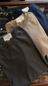 12ゲージの編み機で編まれており、コンサバティブになりすぎないよう、少し表情のある糸を選んでいます。