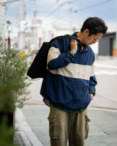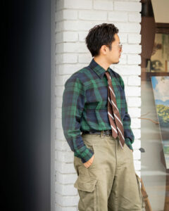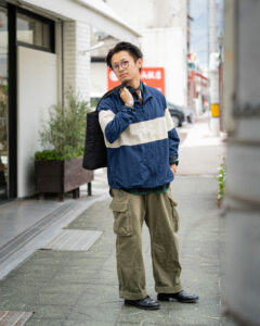 ヴィンテージライクなコーデュロイジャケットに、無骨さとモダンさを兼ね備えたカーゴパンツ。ワーク×ミリタリーの組み合わせを、デイリーに落とし込めるスタイルです。